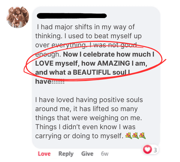 "New way of thinking! From self-bashing to self-loving! Lifted tons of invisible baggage!"
